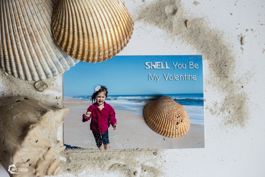 We went to the beach and I snapped a few candid photos of my daughter running around collecting shells. I purposely had her wear a little bit of red (these were for Valentine’s Day after all). She took this blazer off after I took some pictures because it was warm. She is generally a good sport for cooperating with pictures. I added some text in photoshop and printed the 4 x6 pictures out at Costco.